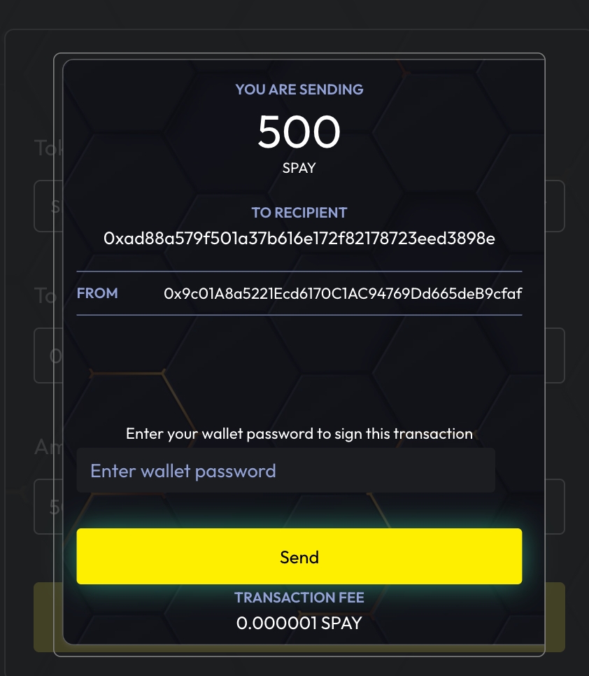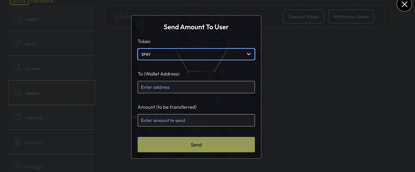Simply head to ‘send’. Click the token you wish to send, the wallet for it to go to, and the amount and click send. You can send to a fellow friend who owns an Script Wallet, yourself (if you have created more than one), or, one of your EVM wallets (so, one that is on Metamask for example)