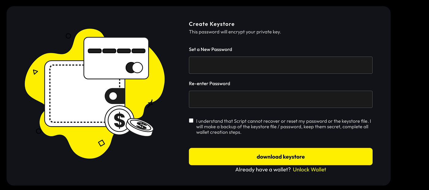 If you create a new wallet, we recommend you do so offline. Once you reach the Script Wallet site, take your device offline / put it in airplane mode, then click “Create Wallet.” Next, you will download an encrypted keystore file and create a wallet password. This encrypted keystore file on your computer will be used to unlock your wallet any time you want to access it. You will then need to copy down the mnemonic/seed phrase (and private key, if you choose to) and store them in a safe place.