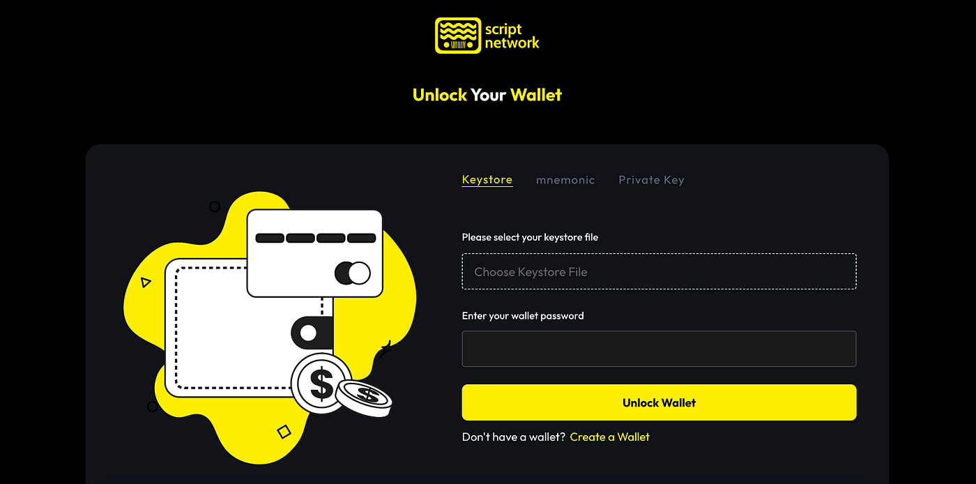 2. You can now choose whether to unlock an existing Script Wallet, or to create a new one (yellow writing at the bottom).