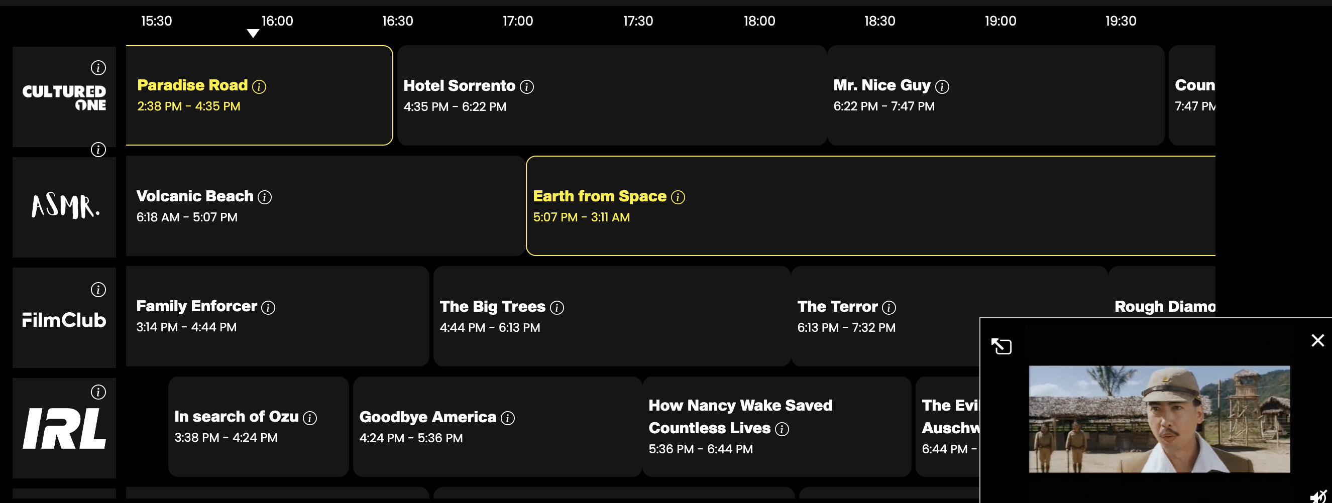 **Electronic Programme Guide (TV Schedule)  -** This is where you can switch channels, and view the upcoming TV shows and films over the coming hours. The timing at the top will match your timezone, and will run for the time that the respective show / film shows under the respective names. Like television you sit and watch on your sofa, this is NOT on demand television, and you do not have the ability to pause, skip or rewind. \