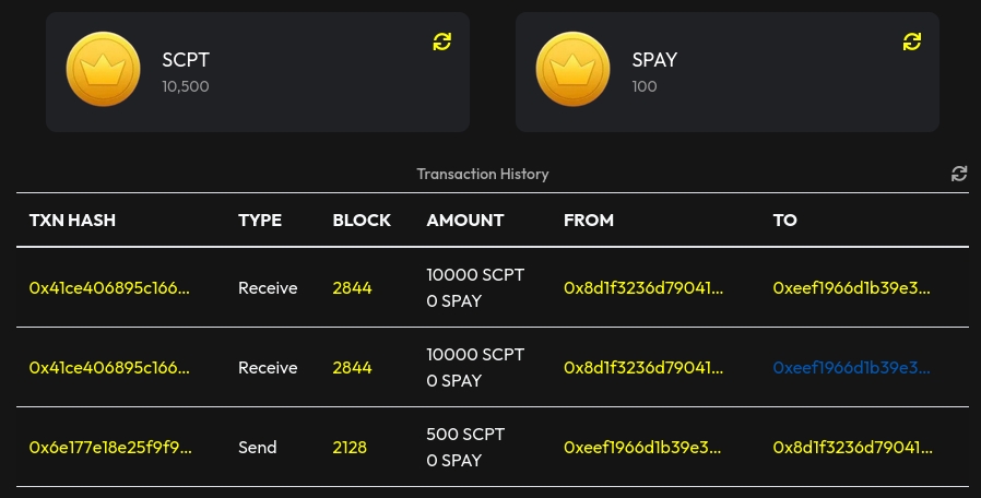 Our balance of 500 SCPT, 100 SPAY checks out.