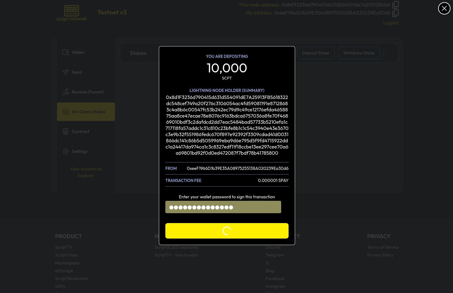 With a balance of 10000 SCPT you can stake your lightning node from the browser wallet.