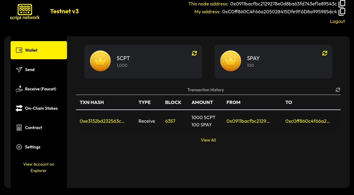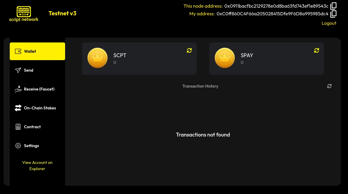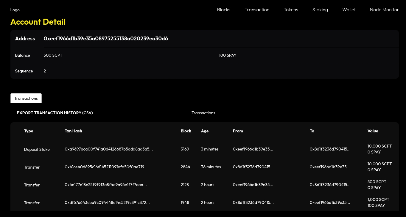 This screen shows your SCPT and SPAY balances and the history of transactions.