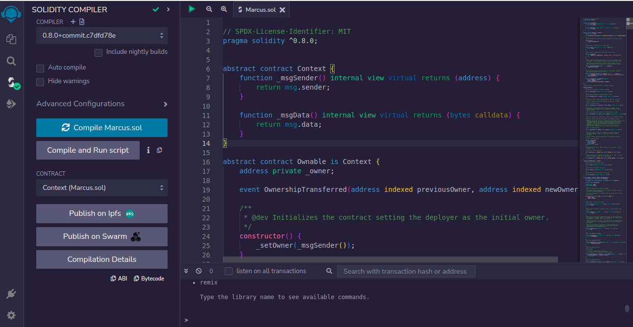3. Next, You’ll need to set the Compiler to the version you have used to write the code, and in the Contract field respective contract is selected. Then click the blue button that says “Compile {FILE\_NAME}.sol”.