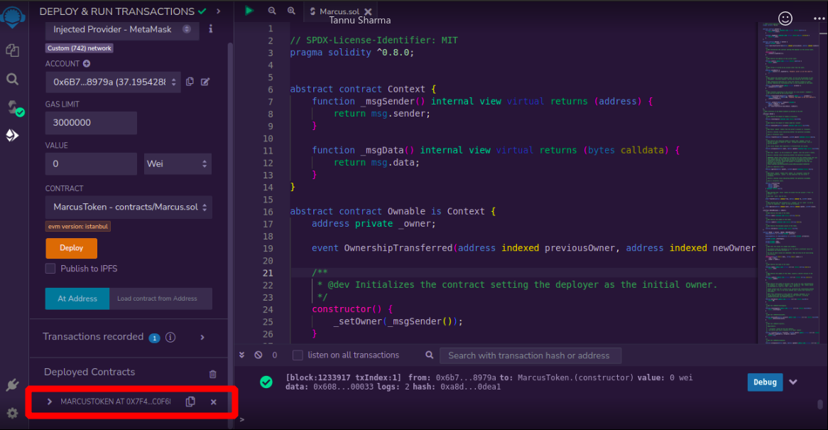 * After few seconds you will get the confirmation pop up for the successful transaction and contract creation in metamask transaction activity area as well as a section enabled on remix with contract address and their respective functions.
