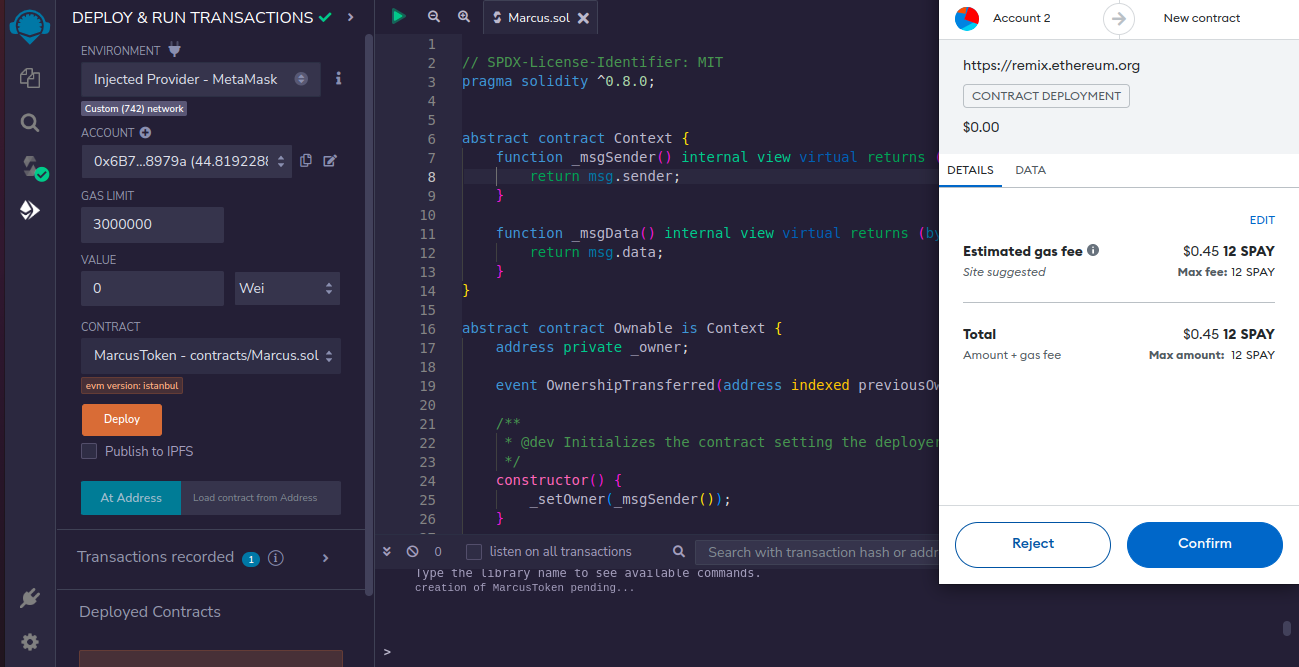 * Select "Injected - Provider Metamask" from Environment dropdown which will help to connect with metamask.(Make sure to switch to script network before proceed for deployment and also make sure to have SPAY token on connected address to pay gas fees)
